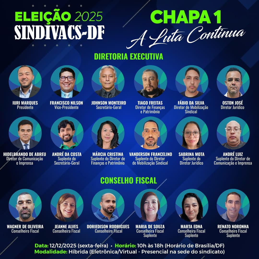 A Comissão Eleitoral considerou apta, como Chapa Única, a Chapa 1: “A Luta Continua!” para concorrer à eleição do SINDIVACS-DF, destinada ao preenchimento dos cargos da Diretoria Executiva e do Conselho Fiscal, referentes ao quinquênio 2026/2031.